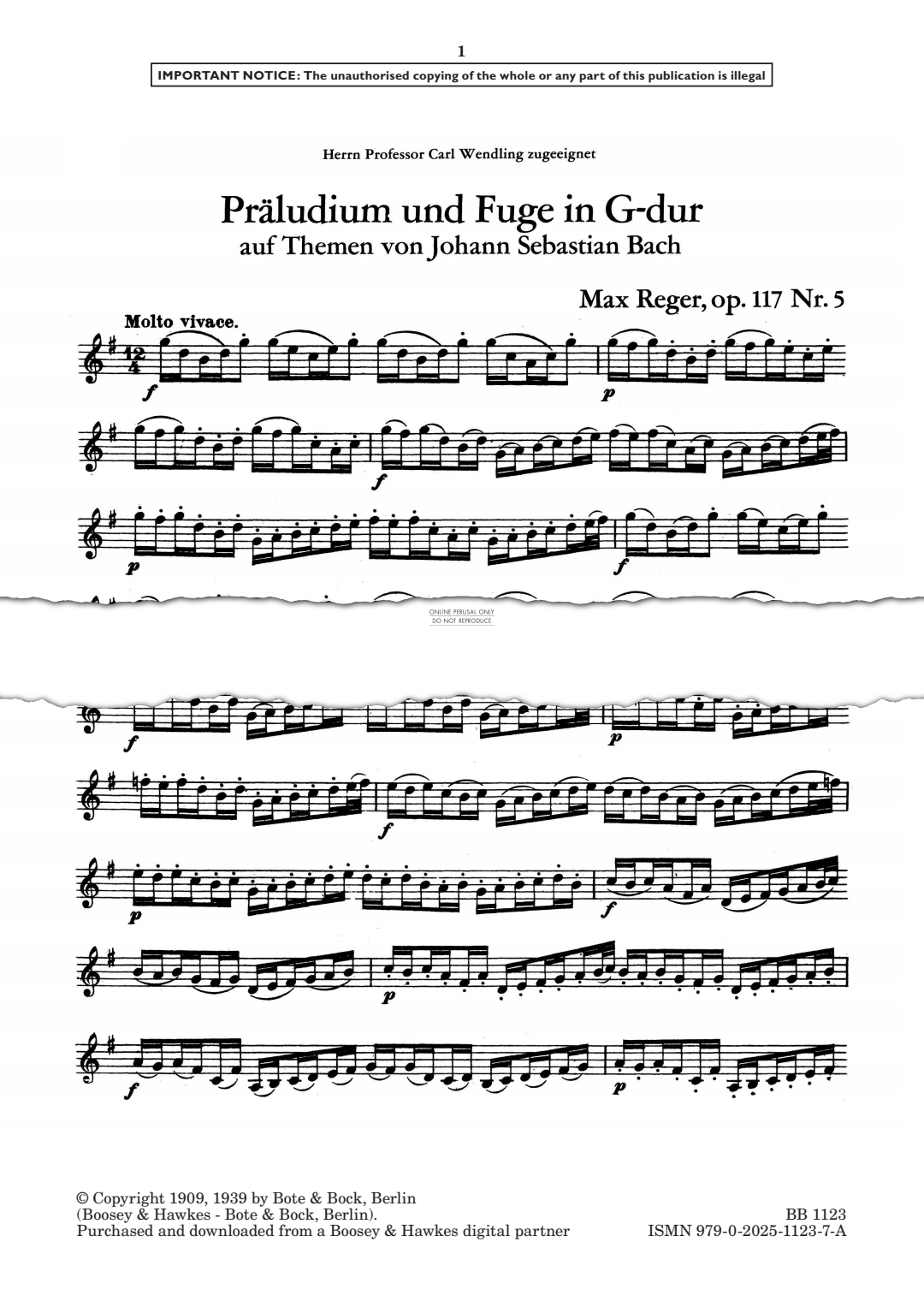 Prelude and Fugue in G Major, Op. 117 No.5 - Noten für Violine Max Reger