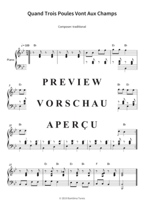 Dieses Notenheft enthält die Originalnoten zum Kinderlied "Quand Trois Poules Vont Aux Champs" für Klavier. Leichter Schwierigkeitsgrad in B-Dur.