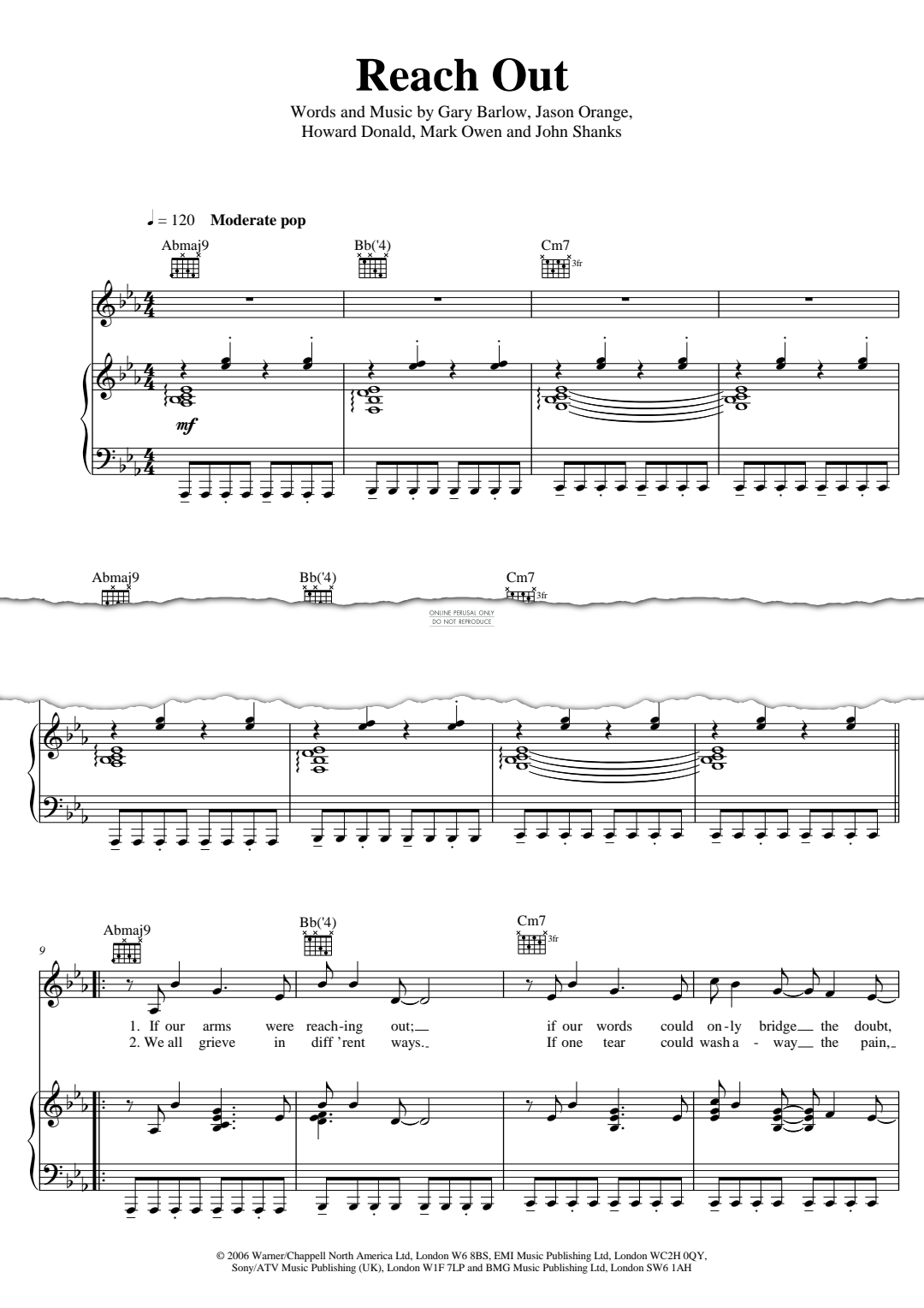 Reach Out - Noten für Gesang, Gitarre, Klavier Take That