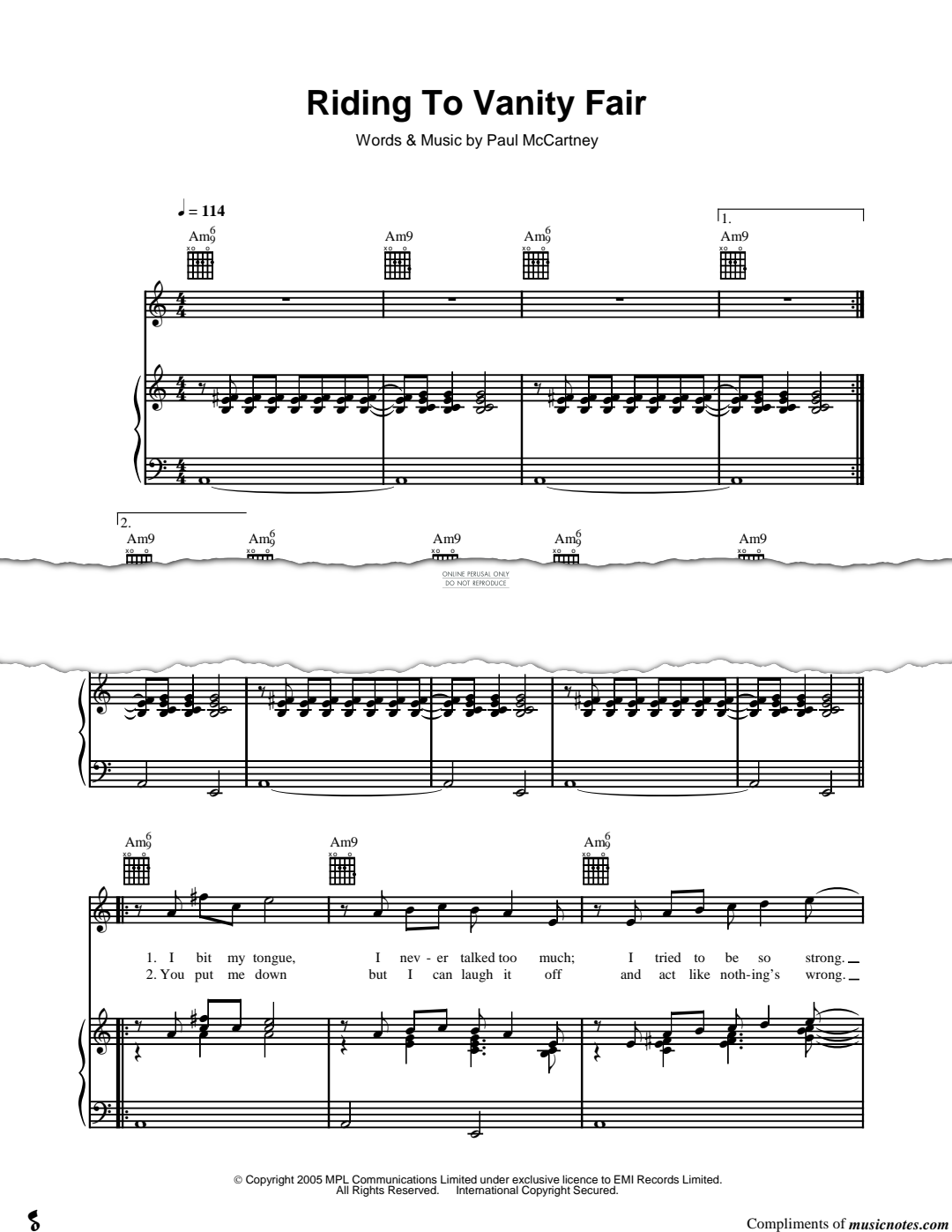 Riding To Vanity Fair - Noten für Gesang, Gitarre, Klavier Paul McCartney