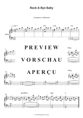 Dieses Notenheft enthält die Originalnoten zum Kinderlied "Rock-A-Bye Baby" für Klavier. Leichter Schwierigkeitsgrad in F-Dur.