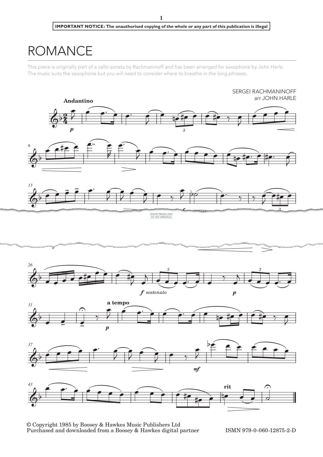 Romance - Noten für Klavier, Saxophon Sergei Rachmaninoff