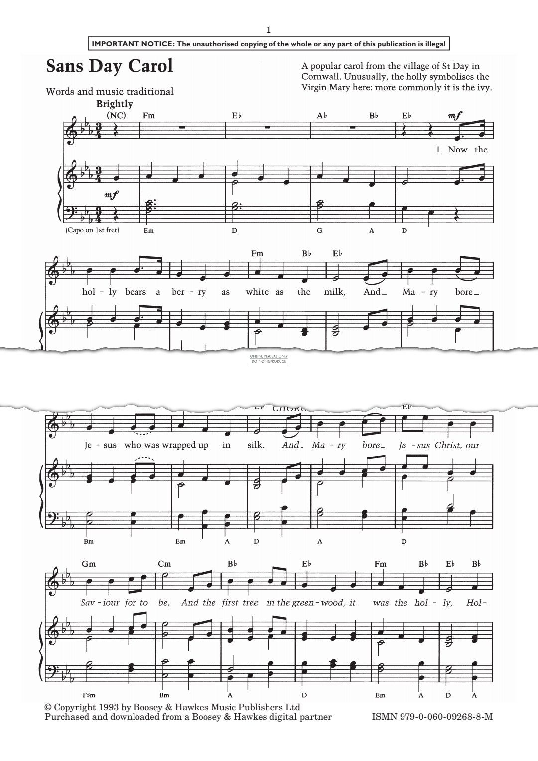 Sans Day Carol - Noten für Gesang, Gitarre, Klavier English Traditional