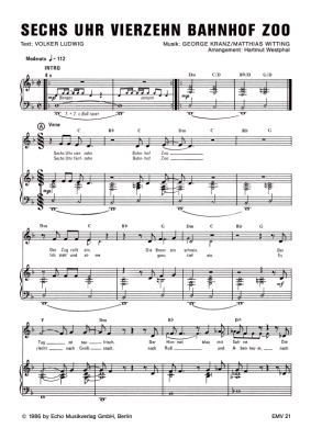 Sechs Uhr vierzehn Bahnhof Zoo - Noten für Klavier und Gesang Grips Theater (Linie 1 Musical)