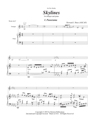 Year Of Composition: 2003 / Duration: 10´30" / (Solo Bb and C parts included.) Cast in 2 powerful and engaging movements, it is a picturesque musical urban portrait. Skylines is loosely programmatic in that no specific city is depicted./ rather, the compo