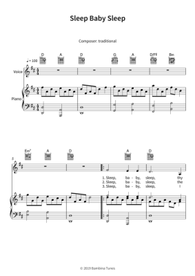Dieses Notenheft enthält die Originalnoten zum Kinderlied "Sleep Baby Sleep" für Klavier, Gesang und Gitarre. Leichter Schwierigkeitsgrad in D-Dur mit Liedtext.