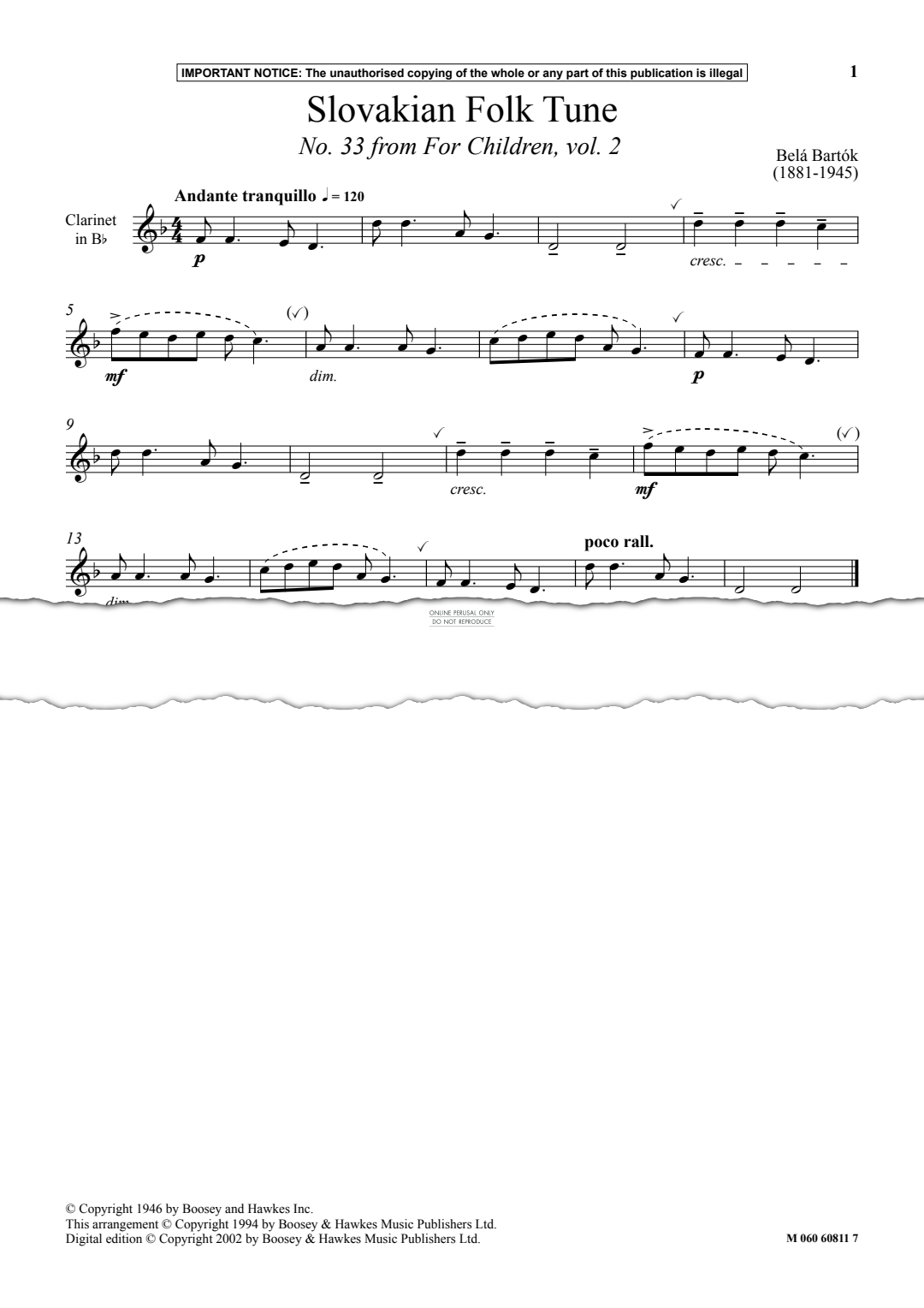 Slovakian Folk Tune (No. 33 from For Children Volume 2) - Noten für Klarinette, Klavier Bela Bartok