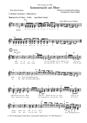 Notenausgabe für Schlagzeug, Violinen, Akkordeon, Alt-Sax., Tenor-Sax., Gitarre, Piano, Trompete, Posaune, Bass und Gesang.