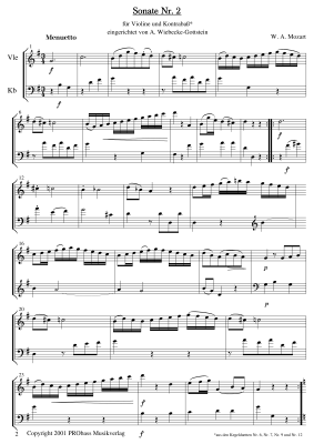 Eine Sonate für Violine und Kontrabass von Mozart? So ist es. Diese Sonaten (s. auch Best. Nr. V 103 und 105) bestehen aus jeweils 4 Sätzen aus den 12 "Kegelduetten" für zwei Bassetthörner. Das ist für die Konzertpraxis ganz gut, weil 4 Sätze von Mozart als Sonate sich im Konzert besser eignen als das Publikum mit allen 12 Stücken zu ..., na ja "beglücken". Alle 12 wären recht langatmig, obwohl es insgesamt eine angenehme Musik ist, eben Mozart. In wohldosierter Portion von 4 Sätzen sind diese Sonaten eine echte Bereicherung der Kontrabass-Literatur, die für den Bassisten dabei auch noch anspruchsvoll ist, da viele Teile der Bassstimme sich im Violinsystem aufhalten, während für den Geiger das Ganze mehr eine angenehme Übung ist. Die "Kegelduette" liegen auch komplett in einer Bearbeitung für Violoncello und Kontrabass vor und sind auf der CD "cello bass duette" zu hören.