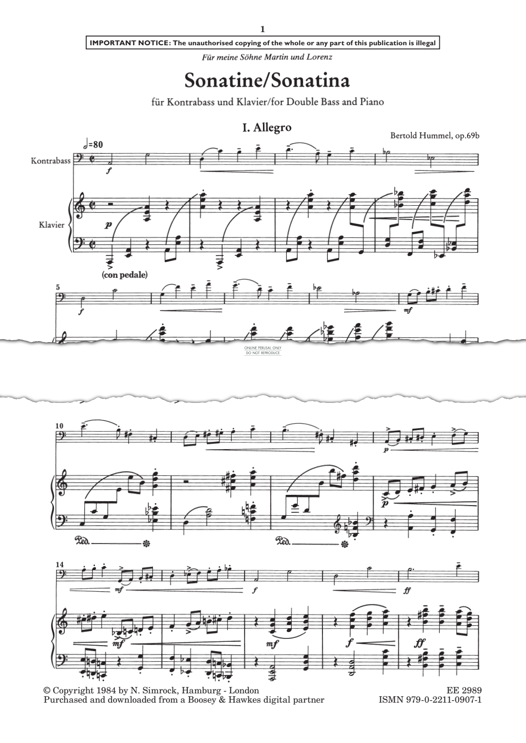 Sonatina, Op. 69b - Noten für Klavier, Kontrabass Bertold Hummel