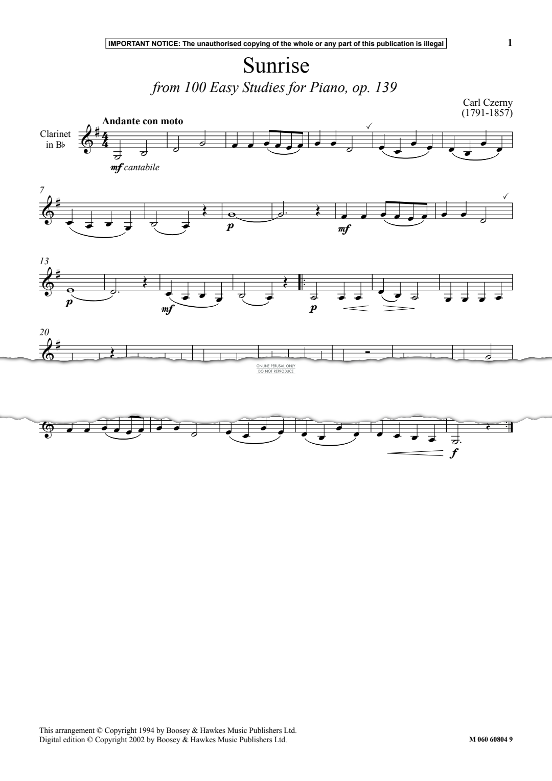 Sunrise from '100 Easy Studies for Piano, Op. 139' - Noten für Klarinette Carl Czerny
