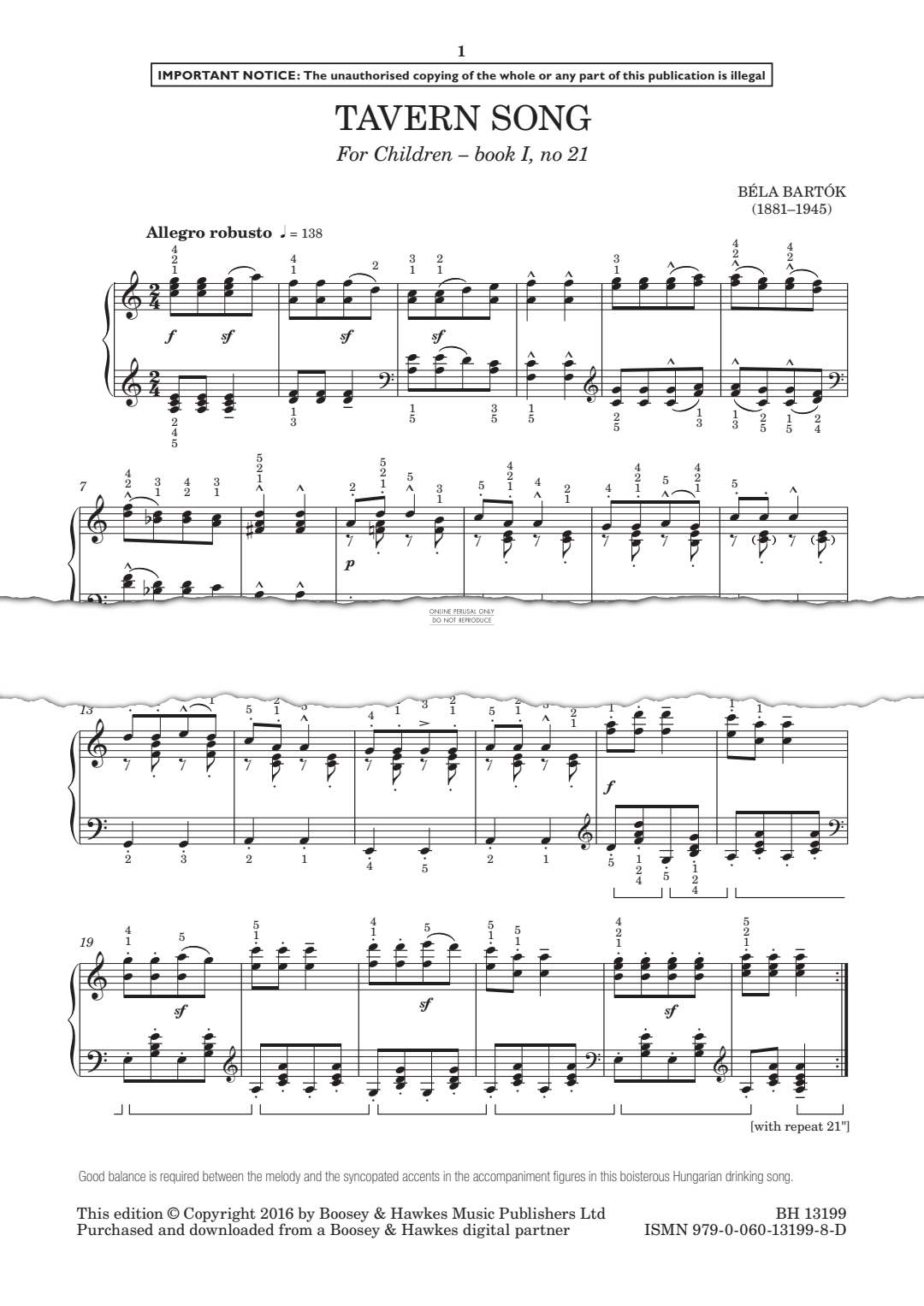 Tavern Song (from For Children - Book I, No. 21) - Noten für Klavier Bela Bartok