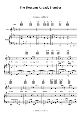 Dieses Notenheft enthält die Originalnoten zum Kinderlied "The Blossoms Already Slumber" für Klavier, Gesang und Gitarre. Leichter Schwierigkeitsgrad in G-Dur mit Liedtext.