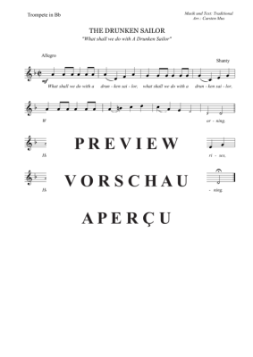 The Drunken Sailor - What shall we do with a drunken Sailor, war ursprünglich ein irisches Tanz und Marschlied, wurde dann 1891 als Seemannslied (Shanty) bekannt. Ein sehr beliebtes Musikstück für die Bb - Trompete. Für den fortgeschrittenen Anfänger bestens geeignet.