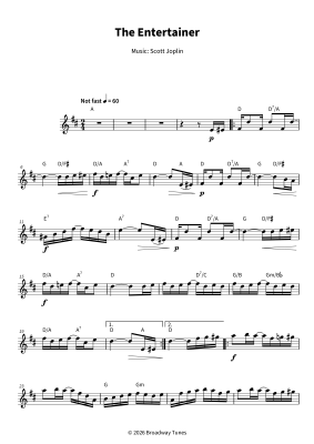 "The Entertainer" is a ragtime classic in C major, set in 2/4 time with that unmistakable syncopated bounce. This simplified lead sheet for tenor saxophone keeps the melody clear and easy to follow, with chord symbols to help guide your way through the form. At about three minutes, it gives you just enough space to capture the cheerful, playful spirit without overwhelming you with detail. The arrangement stays straightforward and practical, whether you´re sight-reading or working it up for a performance. A version that delivers exactly what you´re looking for.