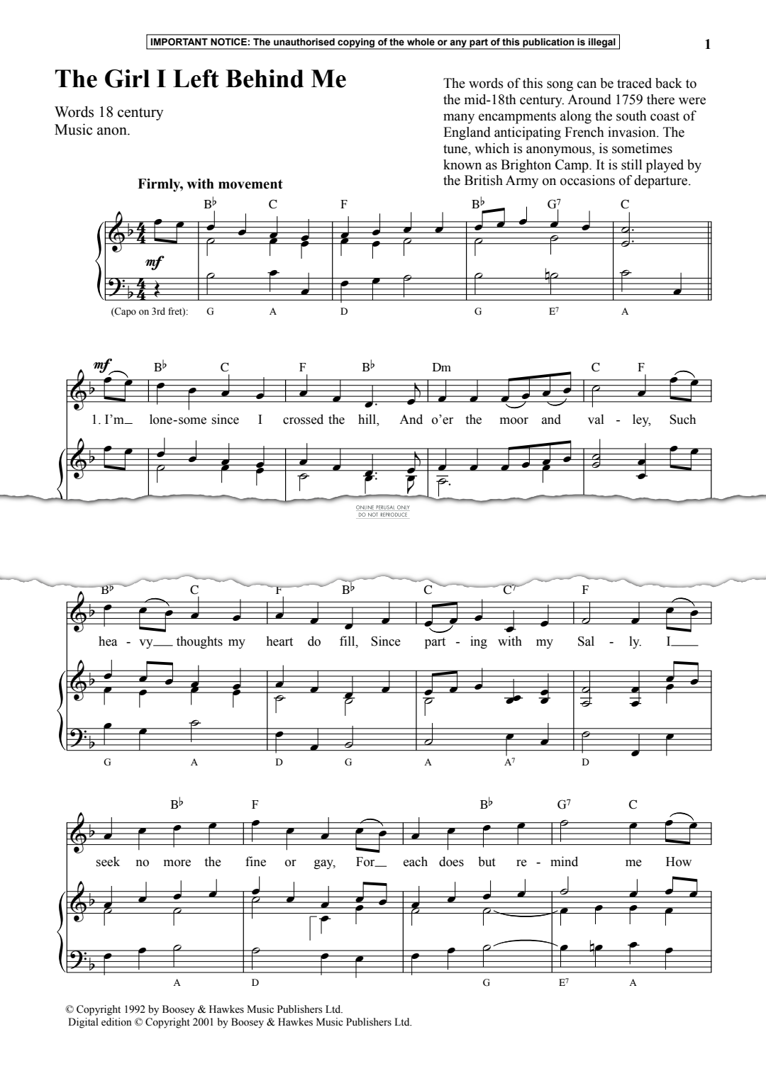 The Girl I Left Behind Me - Noten für Gesang, Klavier Anon