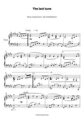 Originalnoten zu "The last tune" für Klavier solo. 2019 veröffentlicht auf zweiten Album "Open Skies" von Hauke Kranz - Die Tastenflüsterin. Die Kompositionen sind inspiriert von Spaziergängen am Meer und im Wald, und erzählen von Aufbruch und Ankommen und der Sehnsucht nach Stille. Als Spielliteratur für den Klavierunterricht mit (fortgeschrittenen) Jugendlichen und Erwachsenen sind sie geeignet, romantische Spieltechniken an neuen Stücken zu vertiefen und die eigenständige Gestaltung zu fördern. Hauke Kranz - Die Tastenflüsterin ist ursprünglich klassische Pianistin und eine erfahrene Klavierlehrerin mit der Spezialisierung auf Erwachsene. Seit einigen Jahren kommen eigene Kompositionen für Klavier solo dazu, die sie im Unterricht erprobt und auf der Konzertbühne in die Welt bringt. Poetic Piano nennt sie ihren Musikstil, der die Stimmung der romantischen Klaviermusik von Schumann, Mendelssohn und Chopin in die heutige Zeit übersetzt und mit Elementen von Filmmusik im Stil von Ludovico Einaudi, Yiruma und Yann Tiersen kombiniert.