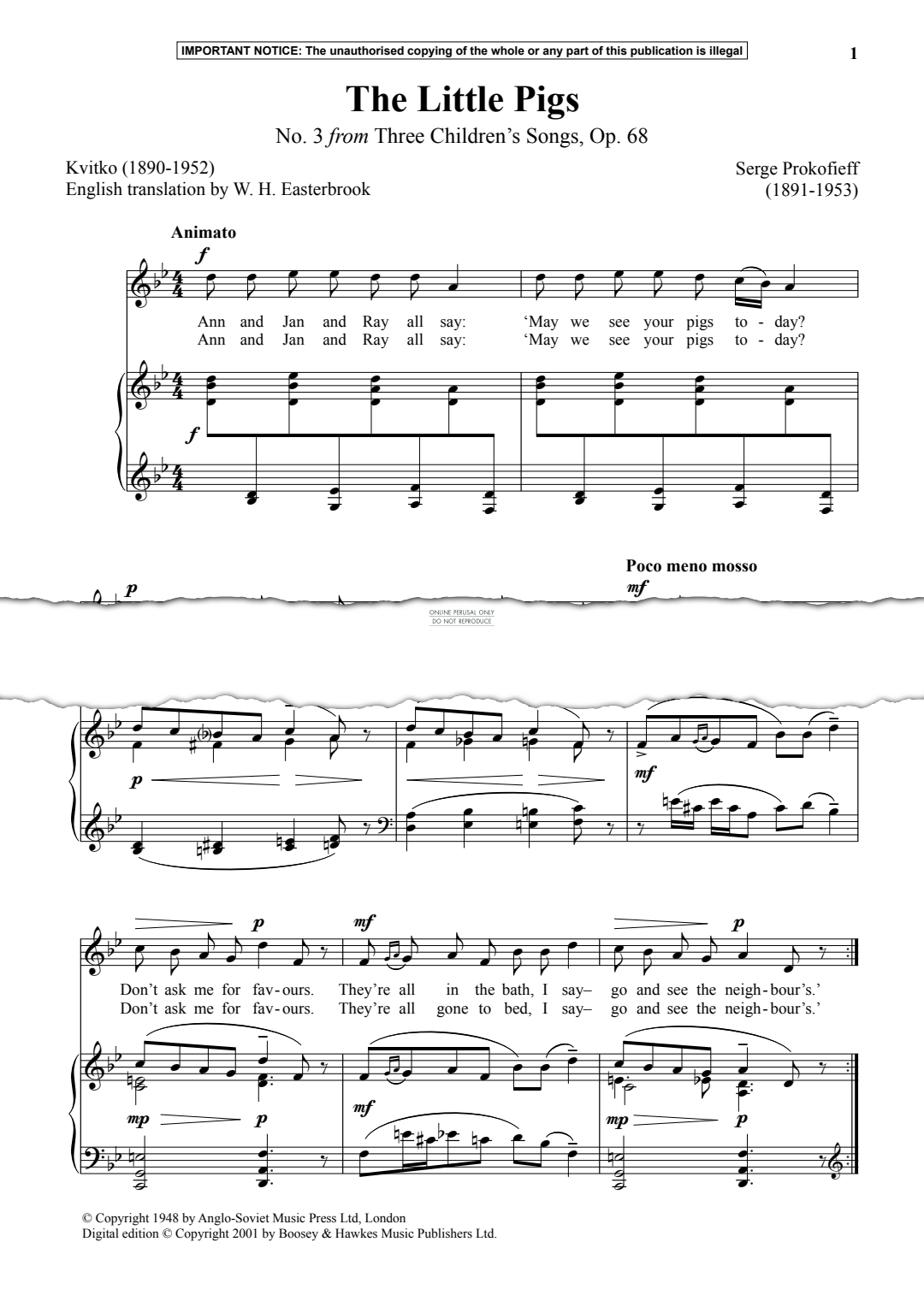 The Little Pigs, No. 3 from Three Children’s Songs, Op. 68 - Noten für Gesang, Klavier Serge Prokofieff