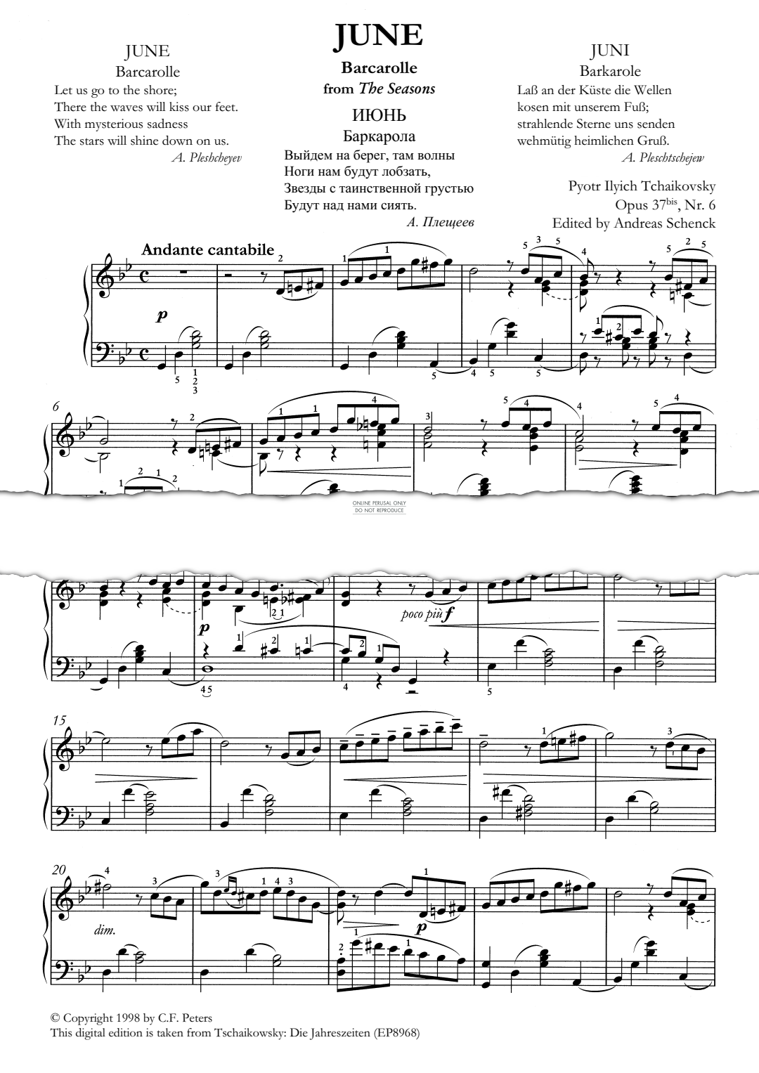 The Seasons Op.37a, Movement VI: June - Noten für Klavier Pyotr Ilyich Tchaikovsky