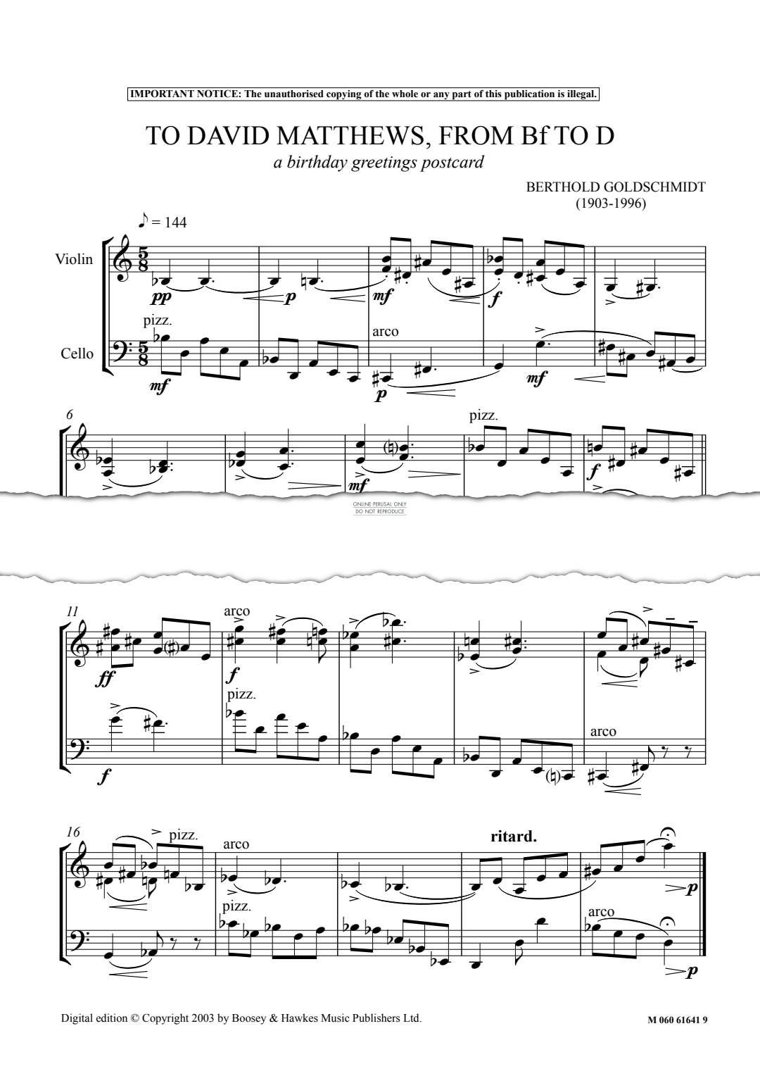 To David Matthews, From Bf To D (A Birthday Greetings Postcard) - Noten für Violine, Violoncello Berthold Goldschmidt
