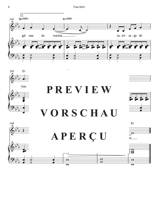 Dieses Notenheft enthält die Originalnoten zum Song "Trau Dich" von Berge für Klavier und Gesang. Leichter Schwierigkeitsgrad in Es-Dur mit Liedtext.