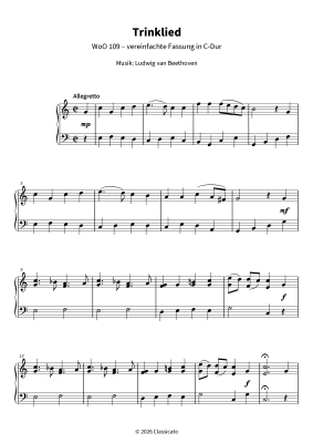 "Trinklied" (WoO 109) ist ein leichtes Klavierstück in C-Dur, das sich schnell erschließt und gut in den Händen liegt. Die vereinfachte Fassung bewahrt den fröhlichen Charakter des Originals und lässt sich bereits nach kurzem Durchspielen flüssig vortragen.
