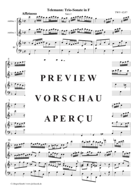Trio-Sonate in F / Satz 1 TWV 42:F7 - Noten für 2x Alt Blockflöte + Klavier/Cembalo-BC Georg Philipp Telemann
