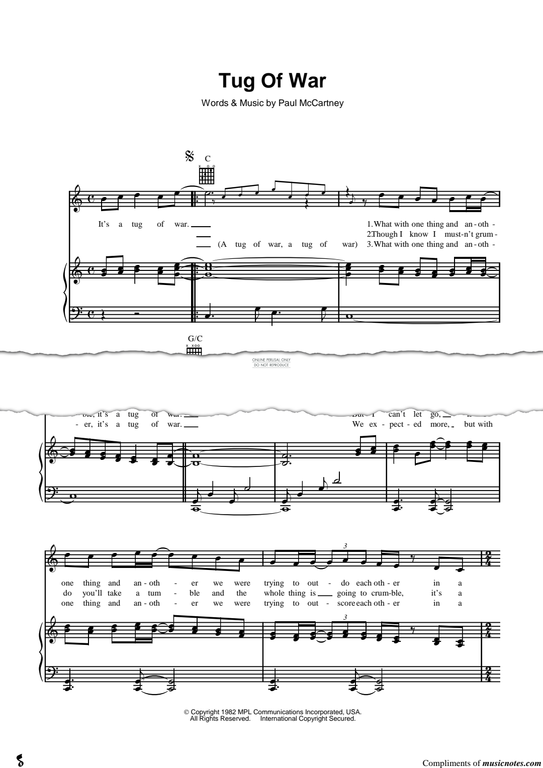 Tug Of War - Noten für Gesang, Gitarre, Klavier Paul McCartney