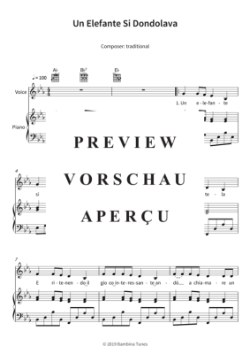 Dieses Notenheft enthält die Originalnoten zum Kinderlied "Un Elefante Si Dondolava" für Klavier, Gesang und Gitarre. Leichter Schwierigkeitsgrad in Es-Dur mit Liedtext.