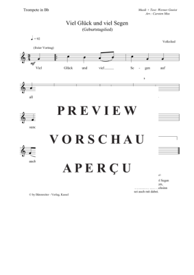Viel Glück und viel Segen - Geburtstagslied (C - Dur) - Noten für Trompete in B Solo Werner Gneist