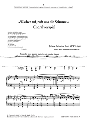 Wachet auf, ruft uns die Stimme (BWV 645) - Noten für Klavier Johann Sebastian Bach