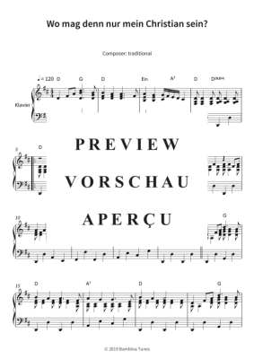 Dieses Notenheft enthält die Originalnoten zum Kinderlied "Wo mag denn nur mein Christian sein?" für Klavier. Leichter Schwierigkeitsgrad in D-Dur.