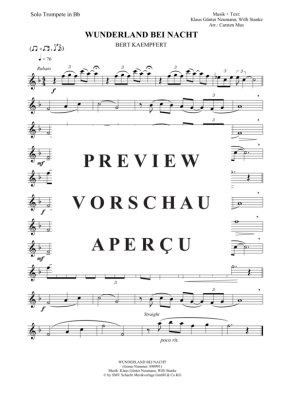 Wunderland bei Nacht ist ein weltberühmter Hit von 1959. Von Klaus - Günter Neumann als Blues komponiert und durch Bert Kaempfert und seinem Orchester bekannt geworden. Ein Arrangement für Solo Trompete in B für den fortgeschrittenen im leichten Swing - Feeling in F - Dur.