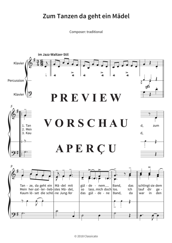 Dieses Notenheft enthält die Originalnoten zum klassischen Stück "Zum Tanzen da geht ein Mädel" für Klavier und Gesang. Mittlerer Schwierigkeitsgrad in G-Dur mit Liedtext.